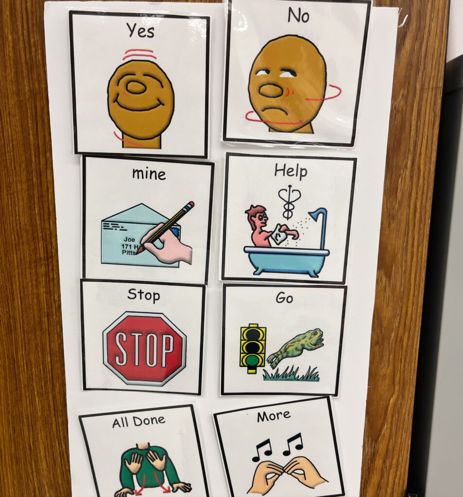 Snack – I have a student who is working using core vocabulary to eat. I have the “more” and “all done” visual present. The student will tap or sign more and I will place a small piece of food on their placemat. This is repeated until the student becomes familiar with this routine. It is great practice for parents to use the same methods at home so the student is getting additional support and practice.